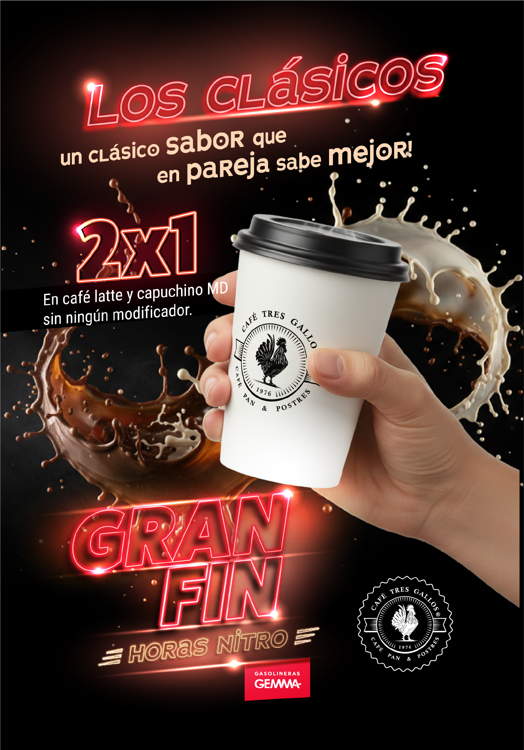Promoción "2x1 en Café Clásico, Lattes y Capuchinos Medianos" Café 3 Gallos x Misión GEMMA Gasolineras GEMMA, a través de su programa de recompensas Misión GEMMA, y en colaboración con Café 3 Gallos, presentan la promoción especial "2x1 en Café Clásico, Lattes y Capuchinos Medianos", disponible durante la temporada Gran Fin GEMMA 2025. 1. Vigencia. La promoción será válida únicamente del 14 al 16 de noviembre de 2025, o hasta agotar existencias. 2. Mecánica. Los usuarios podrán canjear GRATUITAMENTE esta recompensa a través del Catálogo de Misión GEMMA, recibiendo un folio único promocional que deberá presentarse en sucursal. Para hacer válido el beneficio, el participante deberá mencionar su código de promoción GEMMA y mostrar su folio digital o impreso en caja. Cada folio otorga el beneficio de un 2x1 en bebidas participantes, aplicable para Café Clásico, Latte o Capuchino Mediano, sin modificadores. La promoción será válida en todas las sucursales de Café 3 Gallos - Restaurante. 3.Restricciones. Promoción no acumulable con otras ofertas, descuentos o cortesías vigentes. Se podrán canjear máximo tres (3) folios por operación o ticket. No aplica en bebidas modificadas, tamaños diferentes o en productos de temporada. Promoción no canjeable por dinero en efectivo ni por otros productos o servicios. Los folios deberán presentarse en formato físico o digital legible, y serán validados al momento de su uso. Folios únicos, personales e intransferibles. Café 3 Gallos y Misión GEMMA se reservan el derecho de rechazar cualquier folio alterado, duplicado o ilegible. 4. Consideraciones adicionales. La vigencia no podrá extenderse bajo ningún motivo. El beneficio aplica únicamente durante el periodo promocional. Cualquier situación no prevista en estos términos será resuelta por el equipo organizador de Misión GEMMA y Café 3 Gallos. Al hacer uso del beneficio, el participante acepta en su totalidad los presentes Términos y Condiciones. 5. Contacto.Para dudas o aclaraciones sobre la dinámica, comunícate a través del canal oficial de WhatsApp de Misión GEMMA: 222 676 0280.