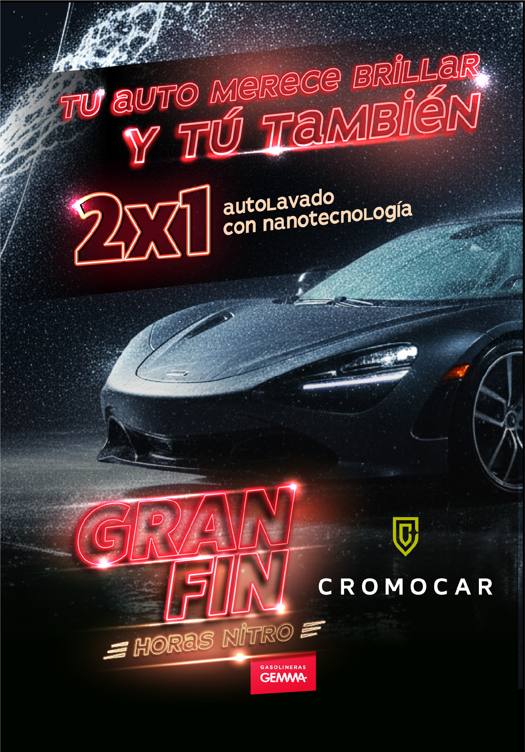 Promoción "2x1 en Autolavado con Nanotecnología" CROMOCAR X Misión GEMMA Gasolineras GEMMA, a través de su programa de recompensas Misión GEMMA, y en colaboración con CROMOCAR, presentan la promoción especial "2x1 en Servicio de Autolavado con Nanotecnología", exclusiva para usuarios registrados en la plataforma Misión GEMMA. 1. Vigencia. La promoción será válida únicamente del 14 al 16 de noviembre de 2025, dentro de la temporada promocional de "Las Horas Nitro", o hasta agotar existencias. 2. Mecánica. Los usuarios deberán realizar el canje del beneficio a través del Catálogo de Misión GEMMA, recibiendo un folio único correspondiente a la promoción. Para hacer válido el beneficio, el participante deberá mencionar y presentar el código de promoción "GEMMA 2x1" al momento de solicitar el servicio en CROMOCAR. EI beneficio aplica en la modalidad 2x1 en Autolavado con Nanotecnología, es decir, al pagar un servicio completo, se otorgará un segundo servicio de igual valor sin costo adicional. Ambos servicios deberán realizarse en el mismo vehículo o en vehículos registrados por el mismo cliente, dentro de un periodo máximo de una (1) semana a partir de la fecha del primer servicio. El monto correspondiente al servicio deberá liquidarse en su totalidad en la primera visita. 3. Restricciones. Promoción no acumulable con otros códigos promocionales, descuentos o cortesías vigentes. Promoción válida solo para servicios individuales, no aplicable a paquetes empresariales o convenios. El segundo servicio gratuito no podrá transferirse, sustituirse o canjearse por dinero en efectivo ni por otros productos o servicios. CROMOCAR será el único responsable de la prestación del servicio, condiciones del lavado y calidad del trabajo realizado. Gasolineras GEMMA y Misión GEMMA no se hacen responsables por daños, desperfectos o situaciones derivadas del servicio proporcionado por el socio comercial. La validación del folio y del código "GEMMA 2x1" quedará sujeta a verificación directa por parte de CROMOCAR, quien tendrá el derecho de aceptar o rechazar la promoción en caso de inconsistencias, alteraciones o mal uso. 4. Consideraciones adicionales. Los folios son únicos, personales e intransferibles, válidos solo durante el periodo promocional establecido. En caso de incumplimiento de cualquiera de las condiciones, el beneficio podrá ser invalidado sin previo aviso. Cualquier situación no prevista en estos términos será resuelta conjuntamente por CROMOCAR Y Misión GEMMA. Al participar en la dinámica, el usuario acepta en su totalidad los presentes Términos y Condiciones. 5. Contacto Para dudas o aclaraciones sobre la dinámica, comunícate a través del canal oficial de WhatsApp de Misión GEMMA: 222 676 0280.